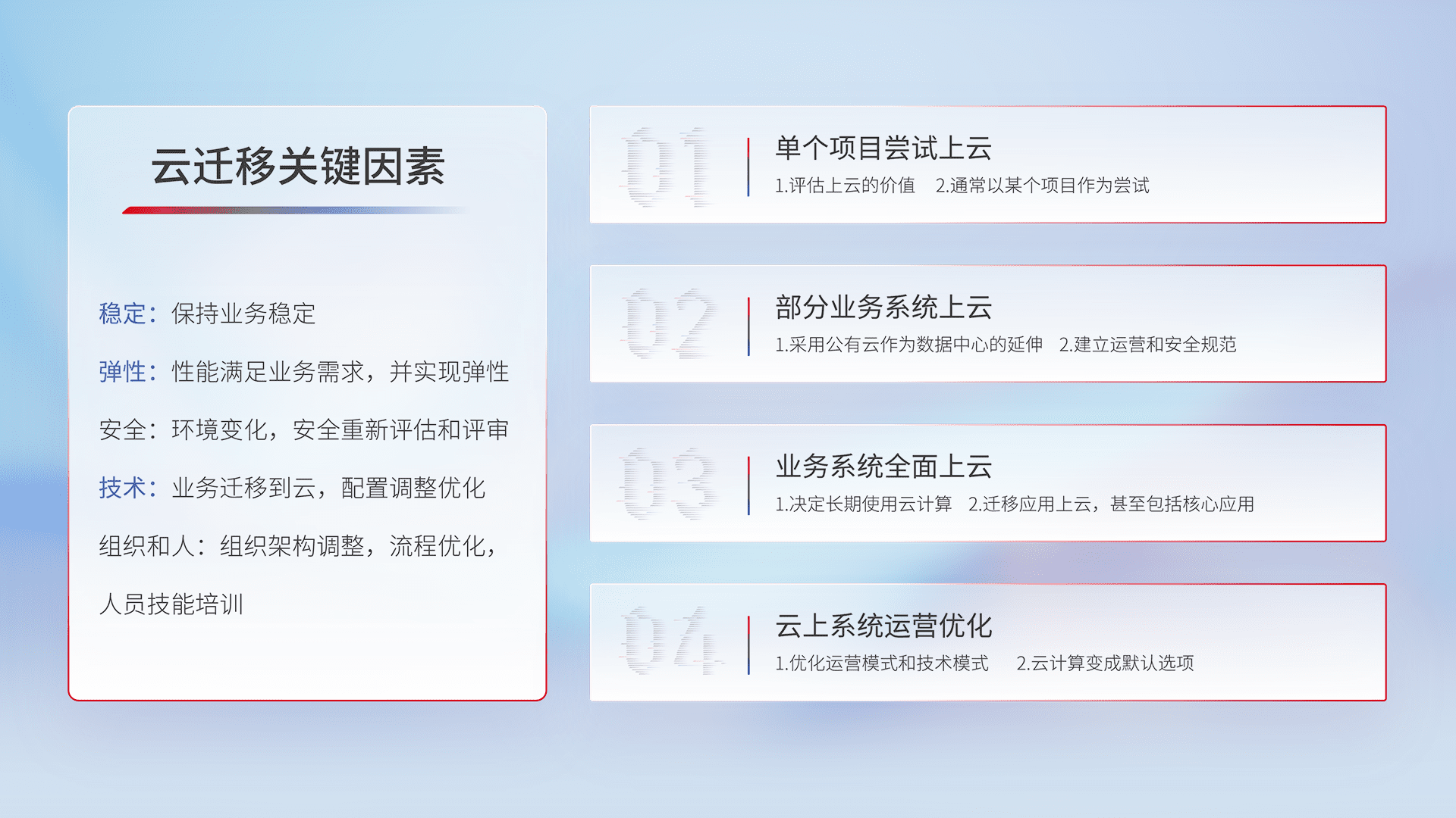 结合实际业务,,,从规划设计、、云平台选型、、、、云原生改造、、、数据迁移、、、集成交付,,迁移全过程为客户识别最佳上云路径,,,,做好风险识别管理,,,,设计网络架构、、、、身份权限、、安全审计合规、、、操作审计、、、日志审计、、、、监控告警策略、、、、多站点容灾设计等,,,对云上基础设施进行整体规划,,提升IT治理水平,,,,以满足弹性、、、高可用、、高性能的需求。。