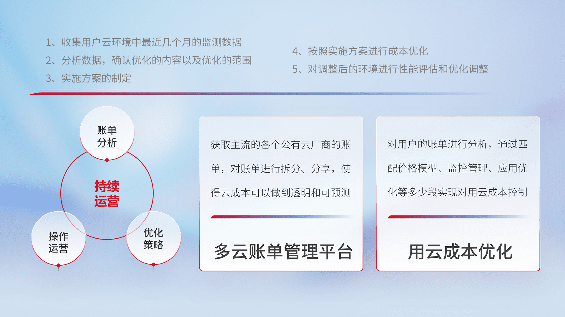 通过多云纳管,,,,以统一的资源数据模型把客户的云资源进行抽象和封装,,,进而实现对多云资源的统一操作,,保障云资源管理的可靠性、、稳定性与可用性。。。量身定制化运维内容,,,配置、、、开发运维、、、补丁管理、、、、备份、、监控、、认证和访问管理、、、审计和日常巡检等,,保障在用云过程中的可靠度,,稳定度以及高可用率。。。
